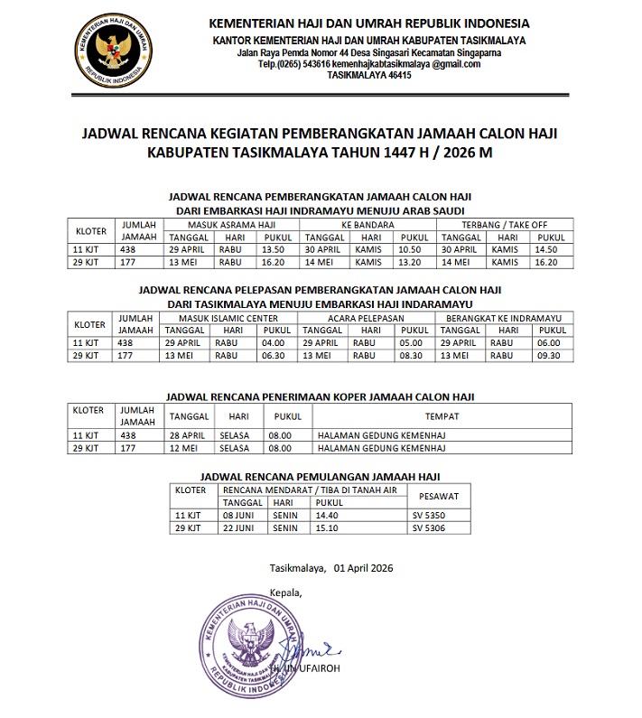 Sementara itu Kasi Pelayanan dan Bina Haji Kemenhaj Kabupaten Tasikmalaya H.Biqi Sabiqul Banan S.Pd.,M.Pd menyampaikan bahwa seluruh jamaah haji kabupaten Tasikmalaya sudah siap untuk melaksanakan tugas mulianya yaitu menunaikan rukun islam yang ke 5 yaitu ibadah haji berikut kami sampaikan jadwal keberangkatan dan kepulangan para jamaah haji asal Kabupaten Tasikmalaya tahun 1447 Hijriyah/2026 Miladiyah jelasnya.(ADE BACHTIAR ALIF/DISHUBKOMINFO)*