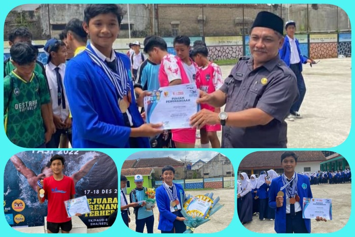 Kab. Tasik LINTAS PENA – Septian Nursya’bana Tim renang junior putra siswa SMPN 1 rajapolah Kabupaten Tasikmalaya berhasil meraih prestasi berupa (Satu medali Emas,gaya kupu 100 m),(satu medali Perak gaya kupu 50m.)(Perunggu gaya punggung 50m)(,Perunggu gaya bebas 50m)(,Perunggu gaya bebas 200m).satu Emas satu perak dan tiga medali perunggu, dalam cabang olahraga (cabor) renang Bandung Fast 2022 yang dilaksanakan di Kolam Renang Sijalak Harupat, kabupaten Bandung pada tanggal 17-18 Desember 2022