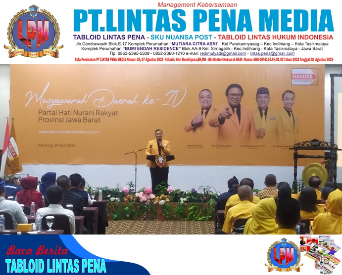 Bandung, LINTAS PENA-—-Dian Rahadian Kembali terpilih sebagai Ketua DPD Partai Hanura Jawa Barat dalam Musyawarah Daerah (Musda) ke IV di Hotel Ultima Horison Kota Bandung, Selasa (28/4/2026).Dorongan semangat dan apresiasi diberikan pula dari Wagub Jabar Erwan Setiawan.
