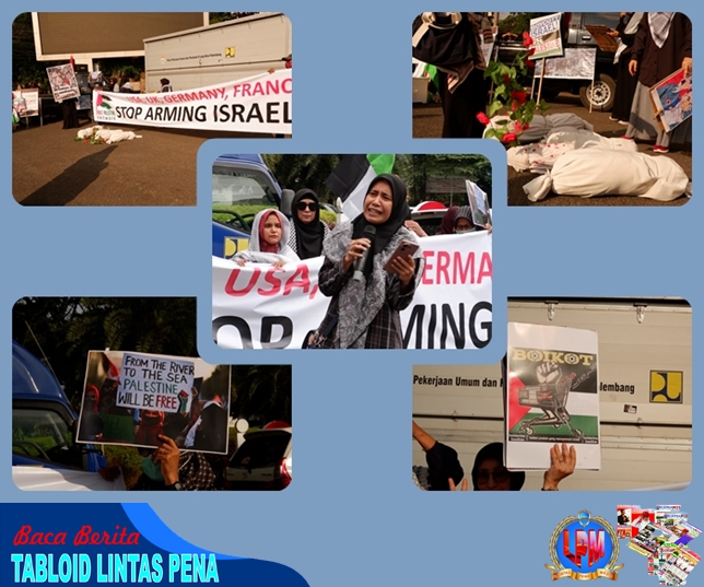 Palembang, LINTAS PENA—-Free Palestine Network (FPN) Pokja Palembang mempelopori aksi damai bela Palestina di depan simpang DPRD Palembang, Juma’t, (20/6/2025). Kali ini FPN Palembang aksi dengan melibatkan ibu-ibu rumah tangga, pemuda dan mahasiswa. Tampak peserta aksi membawa bendera Palestina, bendera Indonesia, berbagai poster dan spanduk sepanjang 6 meter bertuliskan “USA, UK, Germany, Franch, Stop Arming Israel.”