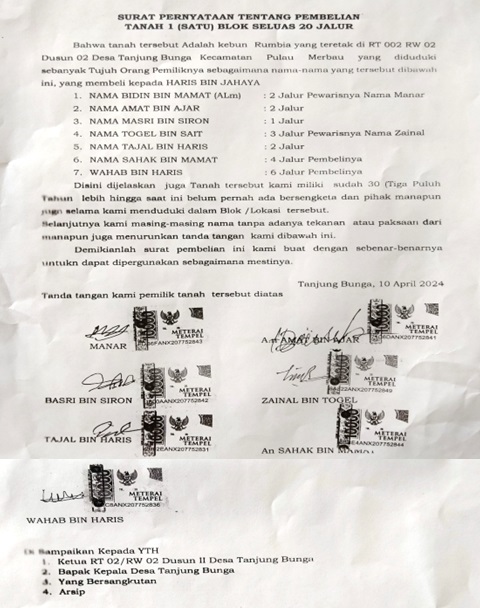 Menurut keterangan Wahab Bin Haris selaku tergugat yang bertempat tinggal di Desa Tanjung Bunga mengatakan kepada media ini “Lahan tanah kebun rumbia 20 jalur tanggal 16 April 1985 yang silam tersebut sudah dikapling-kapling alias sudah dijual, lahan kebun rumbia tersebut dikapling dan dimilki oleh 7 orang masyarakat sesuai dengan surat pernyataan tentang pembelian tanah 1 blok seluas 20 jalur”.
