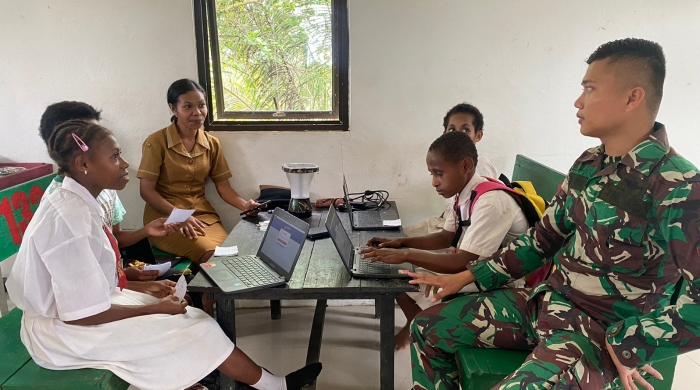 Satgas Yonif 122/TS Pos Wembi Fasilitasi Anak-anak Kampung Wembi Kegiatan Belajar Mengoperasikan Komputer